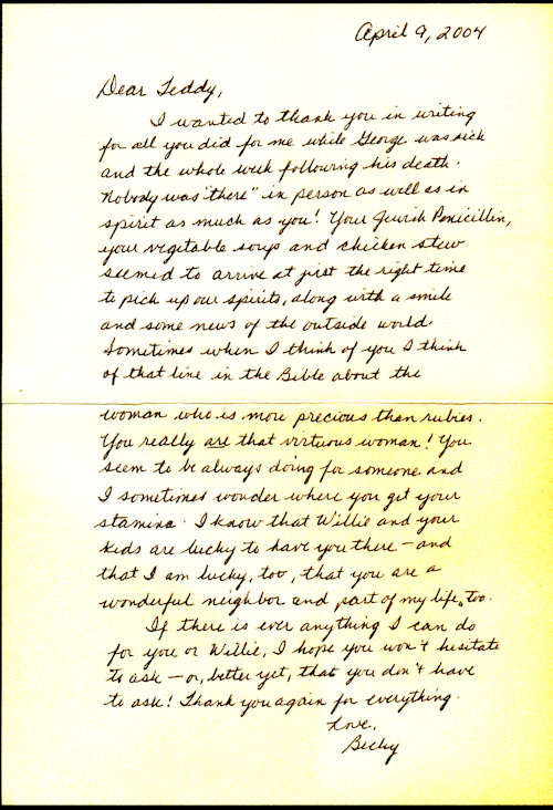 I wanted to thank you in writing for all you did for me while George was sick and the whole week following his death. Nobody was "there" in person as well as in spirit as much as you! Your Jewish Penicillin, your vegetable soup and chicken stew seemed to arrive at just the right time to pick up our spirits, along with a smile and some news of the outside world. Sometimes when I think of you I think of that line in the Bible about the woman who is more precious than rubies You really are that virtuous woman! You always seem to be doing for someone and I sometimes wonder where you get your stamina. I know that Willie and your kids are lucky to have you there - and that I am lucky, too, that you are a wonderful neighbor and part of my life, too.