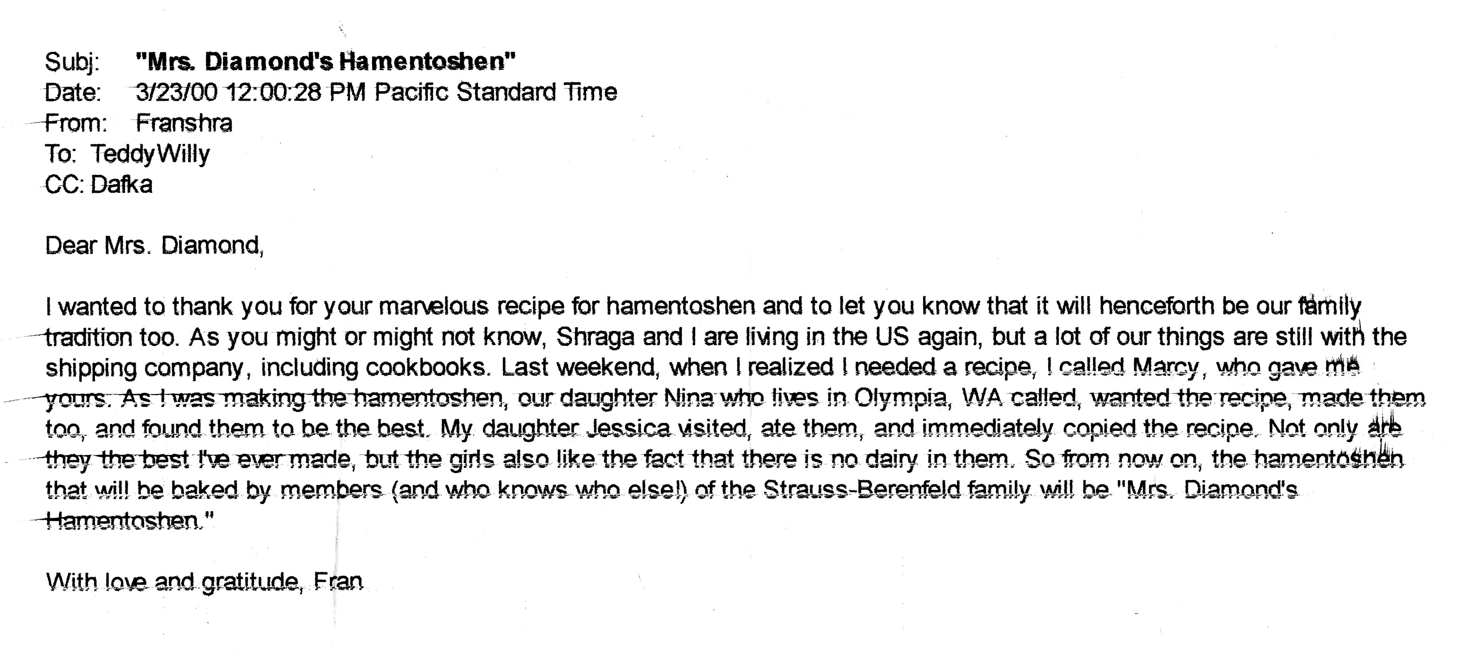 I wanted to thank you for your marvelous recipe for Hamentoshen and to let you know that it will henceforth be our family tradition too. As you might know, Shraga and I are living in the US again, but a lot of our things are still with the shipping company, including cookbooks. Last weekend, when I realized I needed a recipe, I called Marcy, who gave me yours. As I was making the Hamentoshen, our Nina who lives in Olympia, WA called, wanted the recipe, made them too, and found them to be the best. My daughter Jessica visited, ate them, and immediately copied the recipe. Not only are they the best I've ever made, but the girls also like the fact that there is no dairy in them. So from now on, the Hamentoshen that will be baked by members (and who knows who else) of the Strass-Berenfeld family will be "Mrs. Diamond's Hamentoshen."