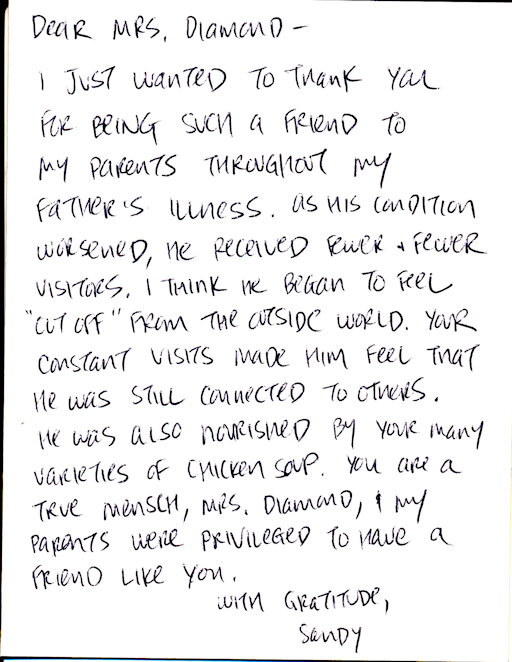 I just wanted to thank you for being such a friend to my parents throughout my father's illness. As his condition worsened, he received fewer and fewer visitors. I think he began to feel "cut off" from the outside world. Your constant visits made him feel that he was still connected to others. He was also nourished by your many varieties of chicken soup. You are a true mensch, Mrs. Diamond, and my parents were privileged to have a friend like you.